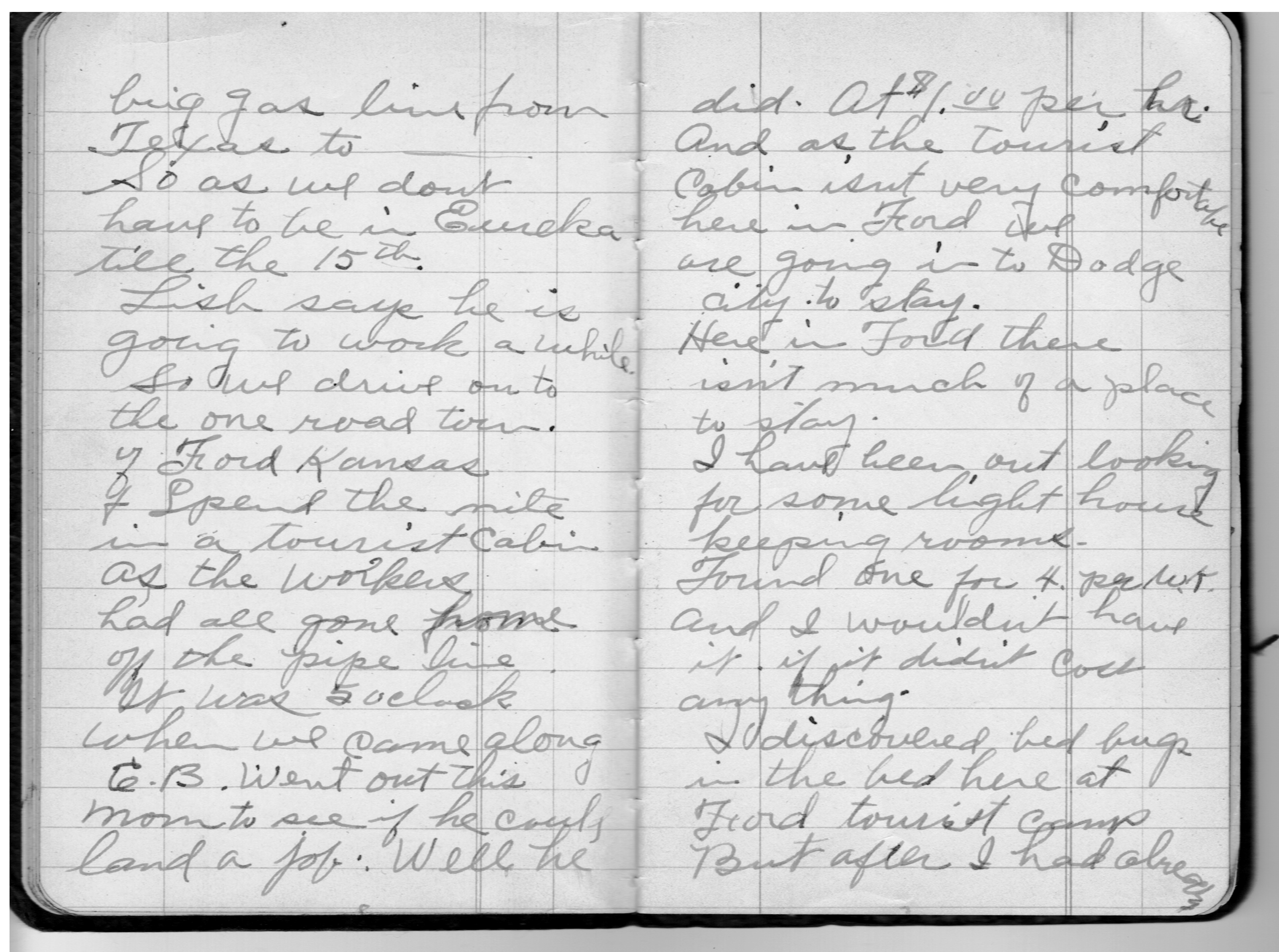 did at $1.00 per hr. And as the tourist cabin isn’t very comfortable here in Ford we are going in to Dodge City to stay. Here in Ford there isn’t much of a place to stay. I have been out looking for some light house keeping rooms. Found one for 4 per wk and I wouldn’t have it if it didn’t cost anything.