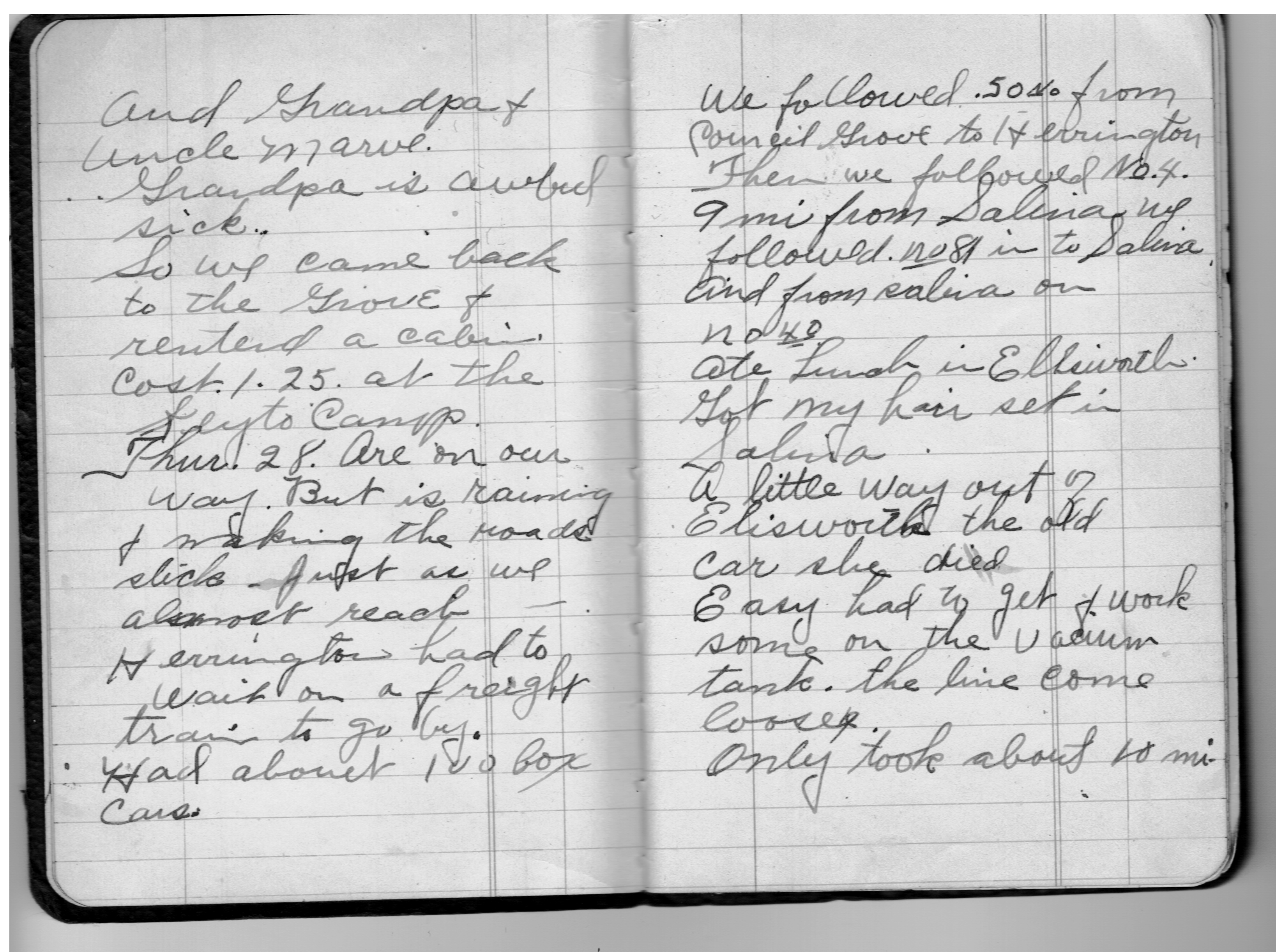 and Grandpa & Uncle Marve. Grandpa is awful sick. So we came back to the Grove & rented a cabin. Cost 1.25 at the Keyto Camp.